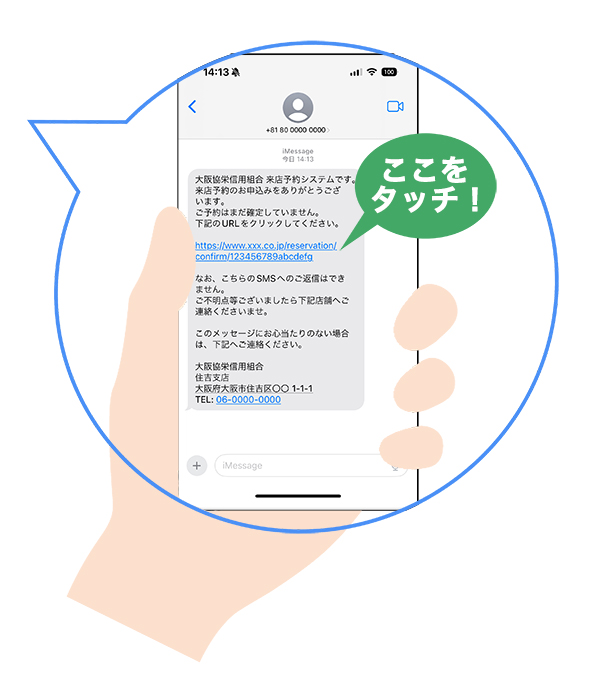 ご入力の携帯電話番号に確認のSMS(ショートメッセージ)が送信されます。 ショートメッセージ内のURL(httpsから始まる文字)をタッチしていただくと、「予約完了」となります。